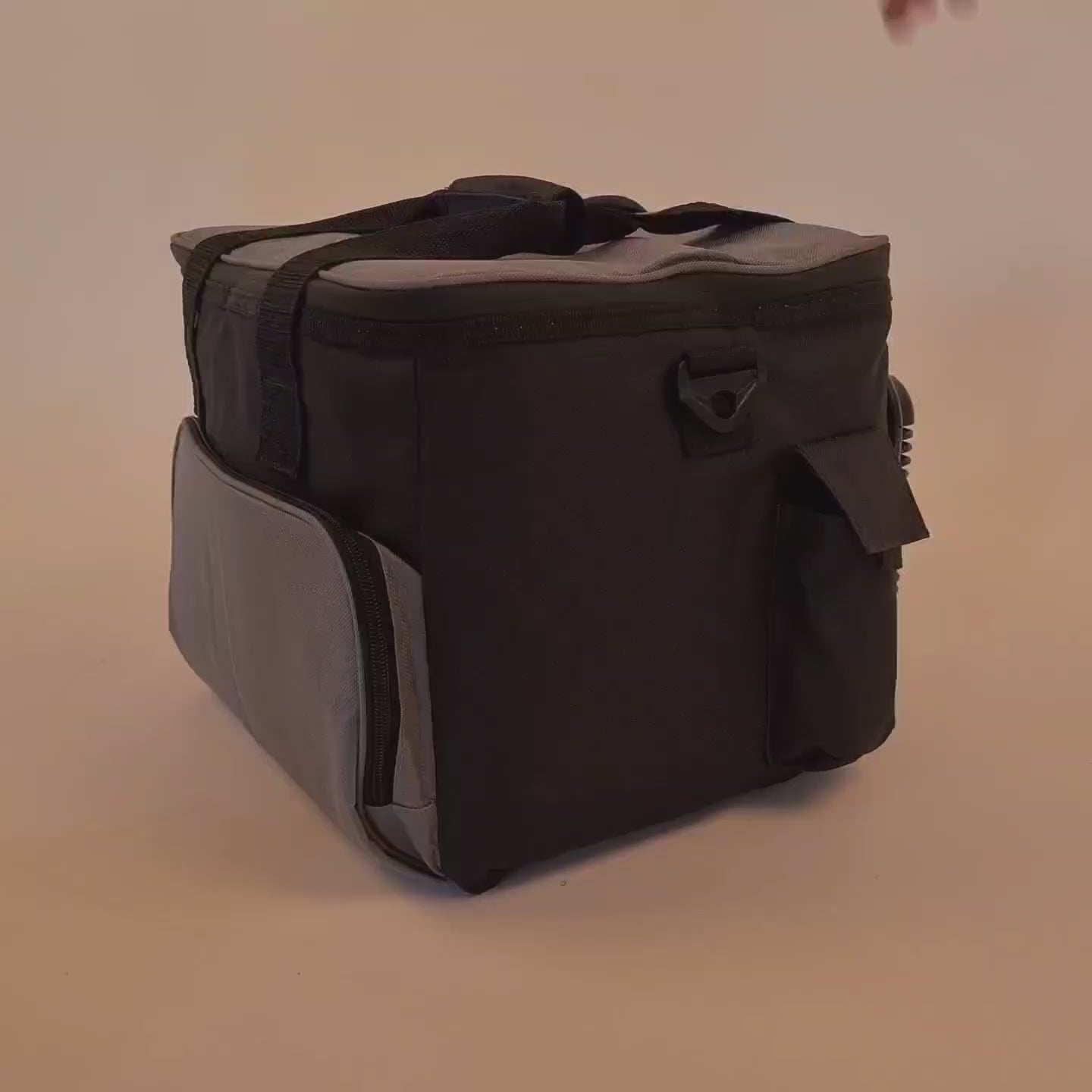 De tas is voorzien van een verstelbare schouderband voor comfortabel dragen. Aan de buitenzijde vind je een handig ritsvak en een apart zijvakje om het 12V snoer netjes in op te bergen. De binnenzijde is goed geïsoleerd en houdt de inhoud 10°C tot 15°C koeler dan de omgevingstemperatuur zodra je de tas aansluit op een 12V aansluiting in de auto.